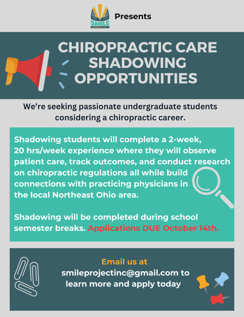 SMILE project, Inc. minimizes financial barriers to chiropractic education, opening doors for young academics and recent graduates. Upholding professional integrity, we ensure family doctors remain available. Our vision begins with Northeast Ohio, and then beyond shaping the future of healthcare.